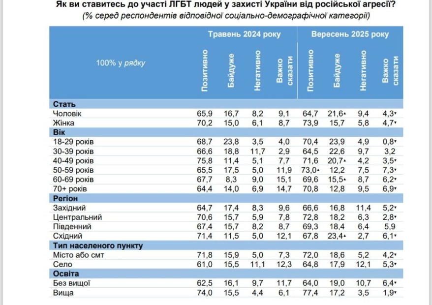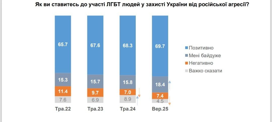 Переважна більшість українців позитивно ставиться до участі ЛГБТК+ людей в обороні України від російської агресії. У 2025 році цей показник сягнув майже 70% і став найвищим за час моніторингу.