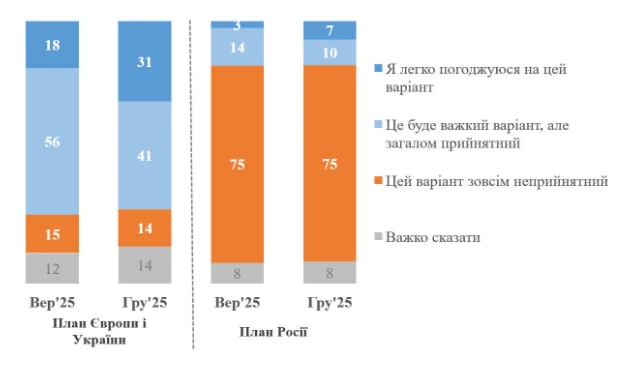 У КМІС розповіли, що аналогічне опитування проводили у вересні 2025 року, тоді 74% готові були підтримати цей план. Водночас з 18% до 31% стало більше тих, хто «легко погодяться на цей план».