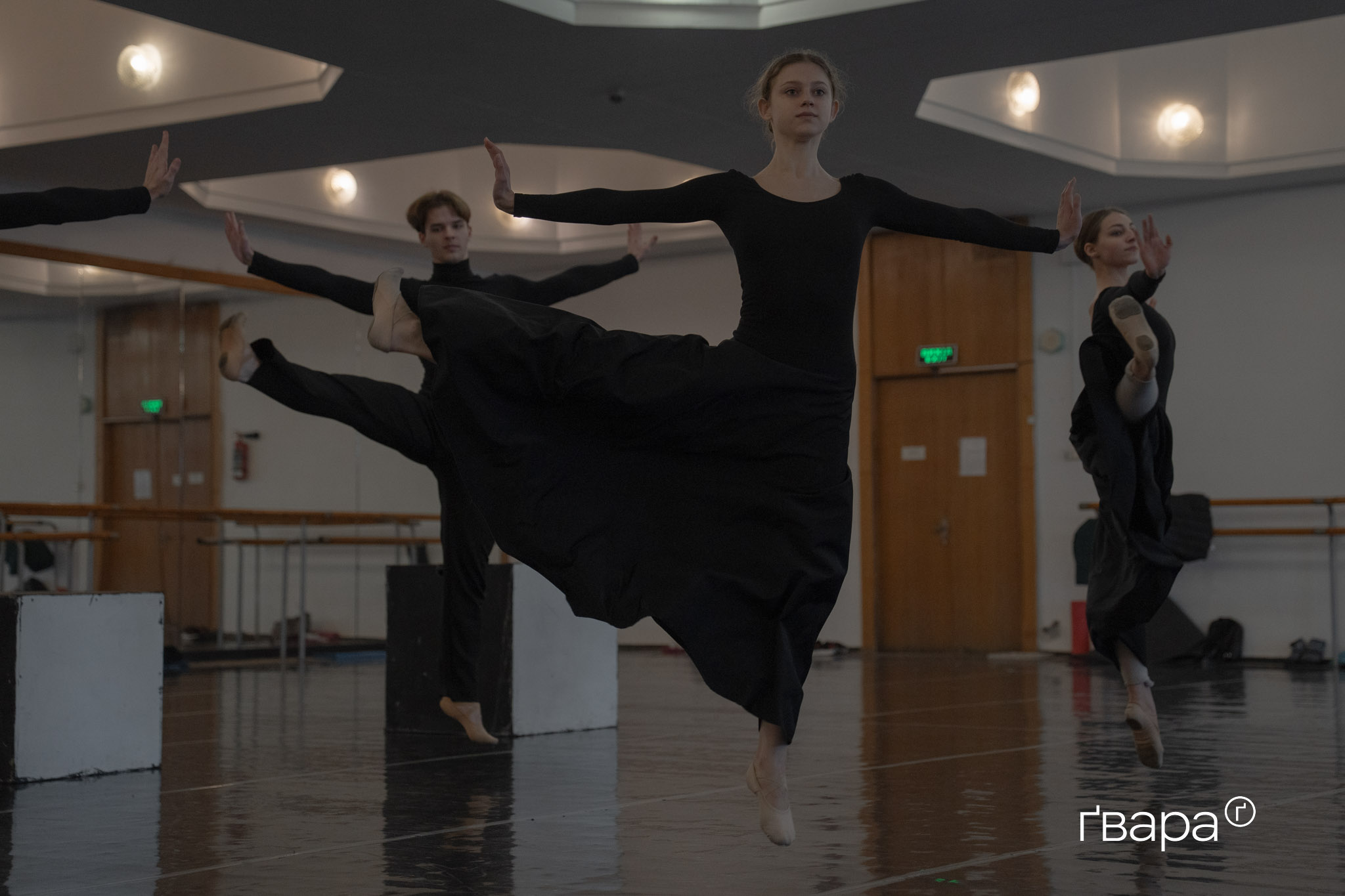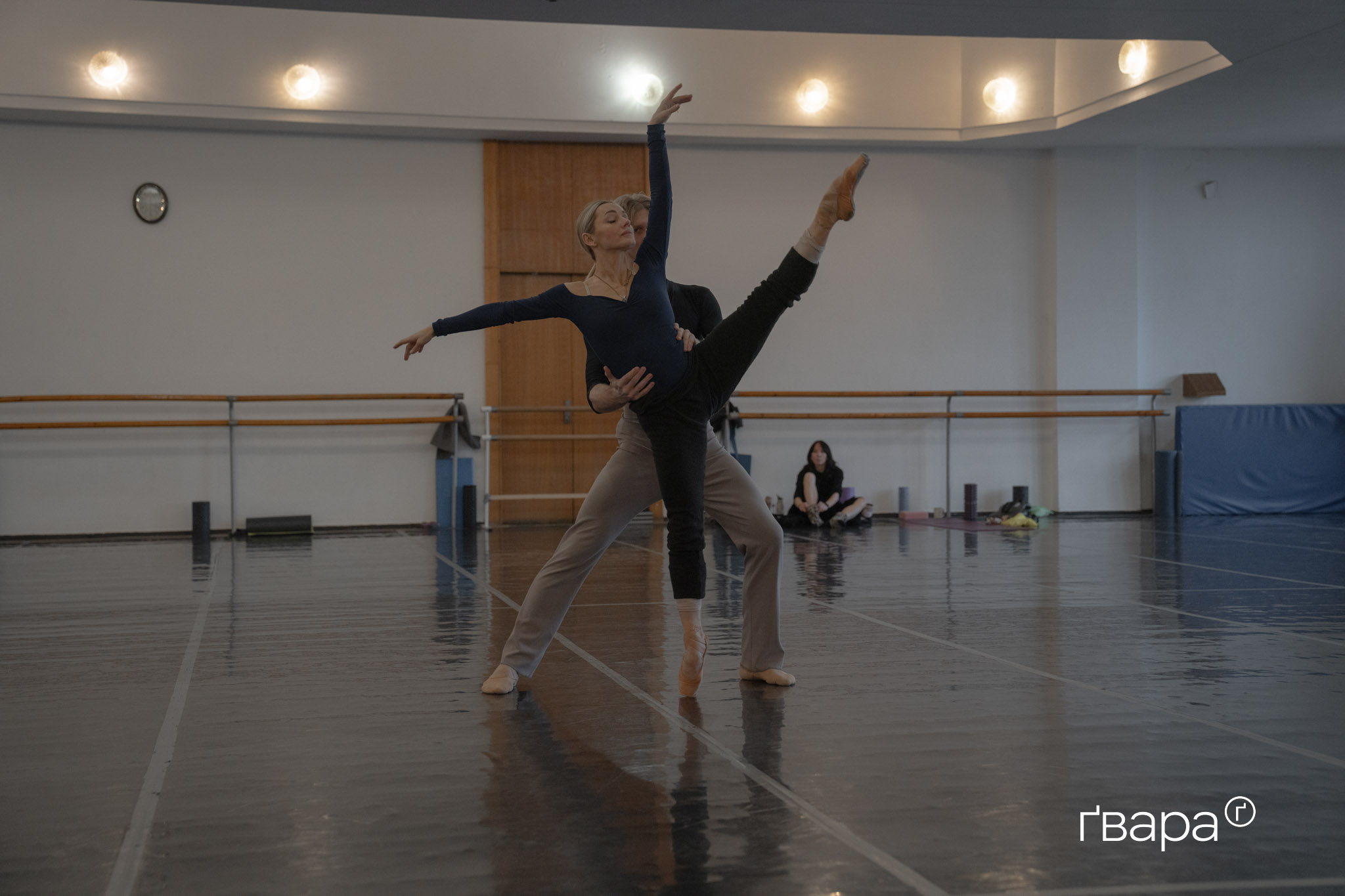 За спиною Антоніни дзеркало на всю стіну. У нім відображається простора зала — лискуча підлога з розміткою, потерті дерев’яні станки вздовж стін, мовчазний рояль та футуристична стеля. А ще партнер, Борис Вендеревських, який розминається короткими стрибками вгору.