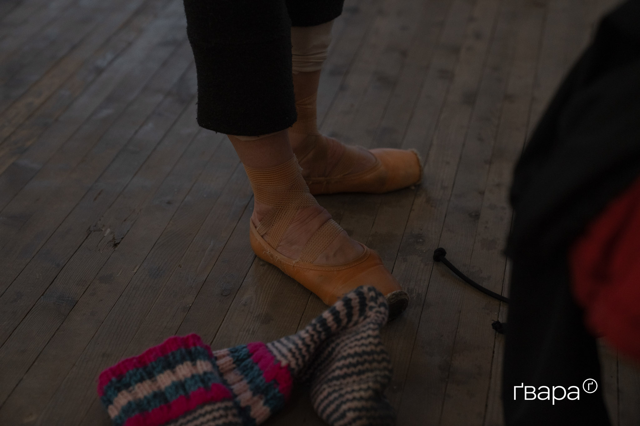 Антоніна Радієвська сидить на лаві й шукає в телефоні музику для репетиції свого танцю. Навіть сидячи, її ноги стоять напоготові — навшпиньках. На них вовняні шкарпетки, бо тут, у залі для репетицій, доволі холодно.