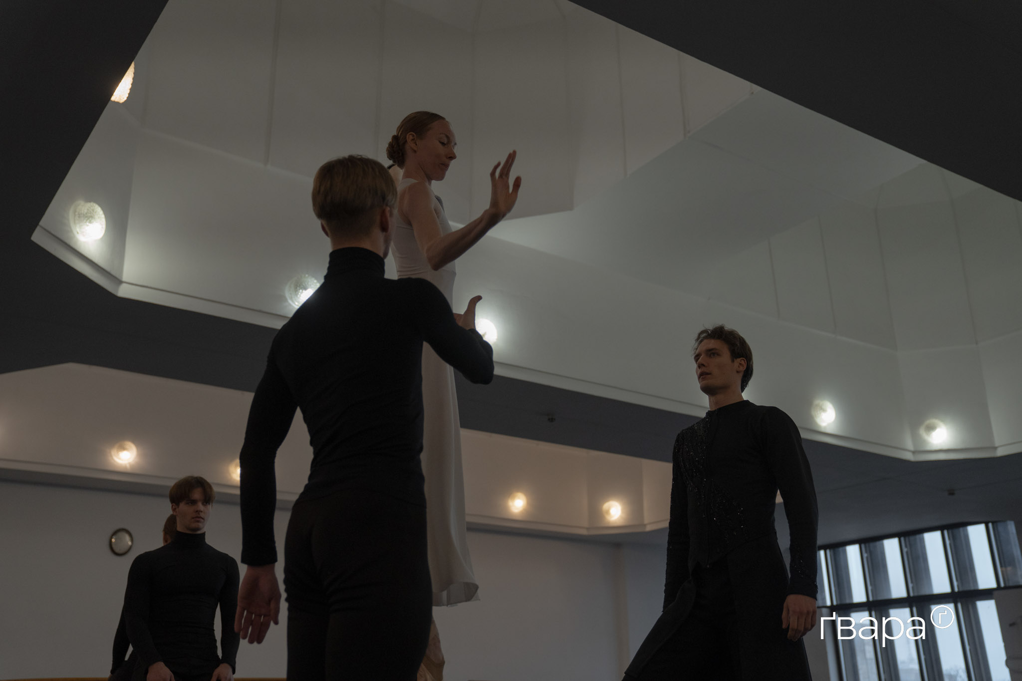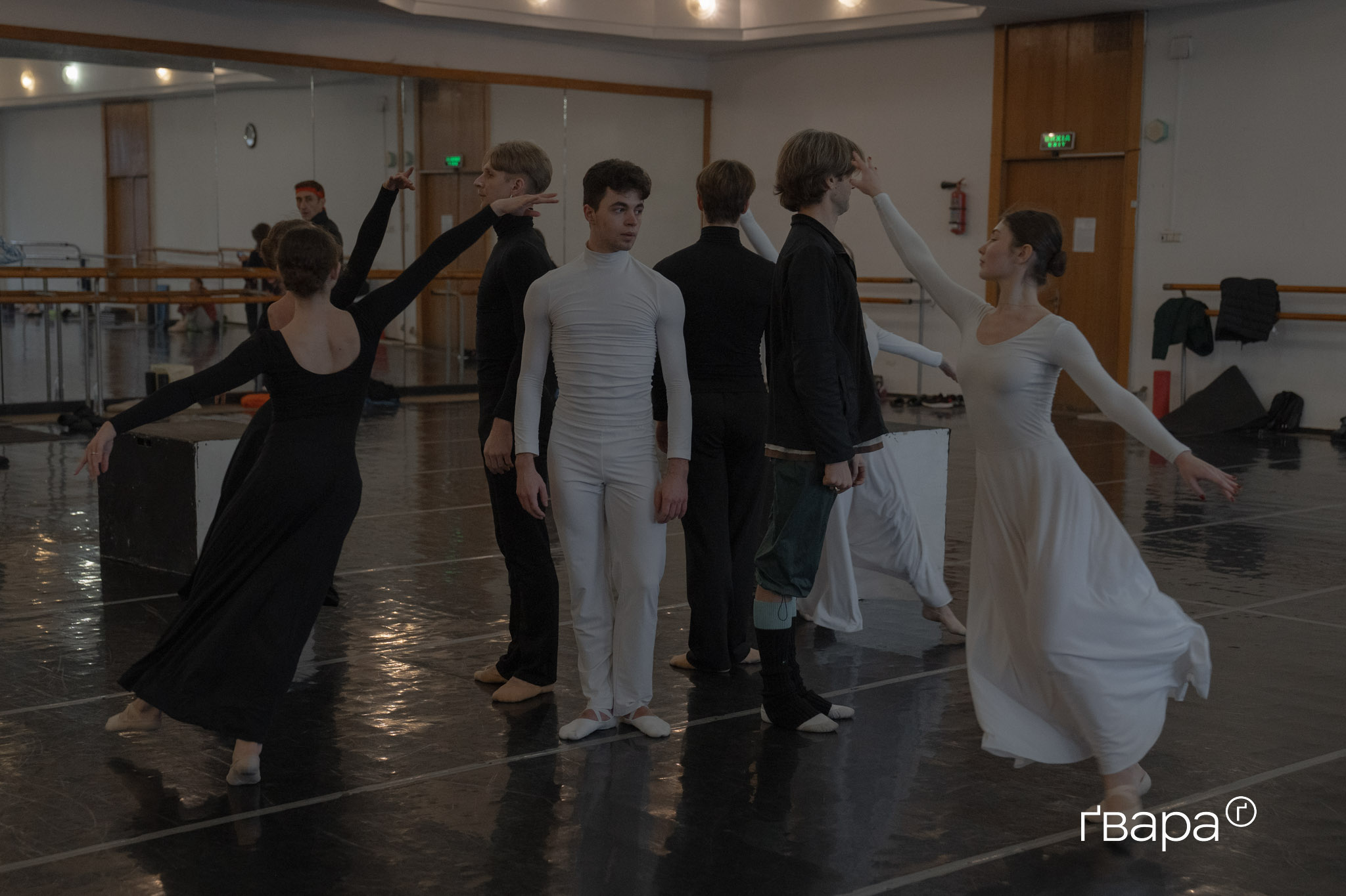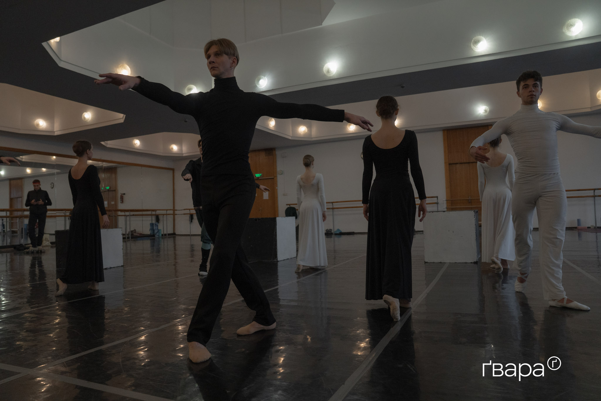 Тим часом у залі почалася вже наступна репетиція номера, частина якого буде показана під час «Різдвяного Гала-Балету». Балерини й танцюристи в чорно-білих костюмах вишикувалися одне навпроти одного. Дехто стоїть поруч на великих кубах.