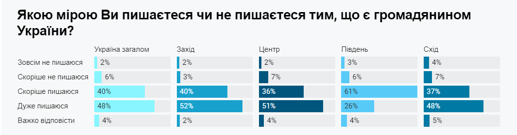 Було опитано 2017 респондентів віком від 18 років у 22 областях України. Відтак, 88% пишаються своїм громадянством. Соціологи зазначають, що найбільшу гордість відчувають мешканці західних областей (93%), менше – українці центральних і південних регіонів (87%) та східних областей (84%). Проте, така кількість людей на Сході зросла з 76% у 2022 році до 84% у 2024 році.