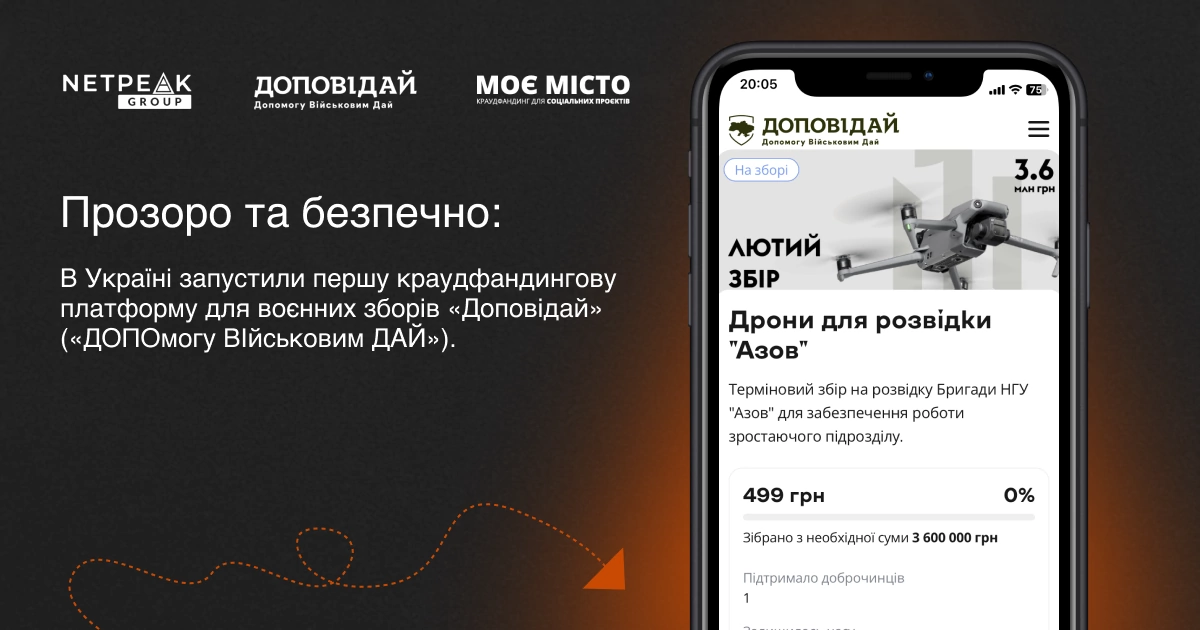 Доповідай («ДОПОмогу ВІйськовим ДАЙ») — це неприбуткова громадська організація, створена для прозорого та безпечного збору коштів на потреби армії шляхом краудфандингу. Це колективне фінансування проєктів, при якому люди підтримують коштами ідеї автора. При цьому, автор збору зобов’язується реалізувати ідею та прозвітувати про результати проєкту.