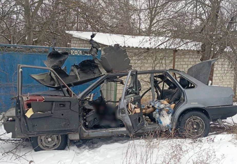 Знищене авто внаслідок удару FPV-дрона у Руській Лозовій, 22 січня 2026 рік / Фото: Дергачівська МВА
