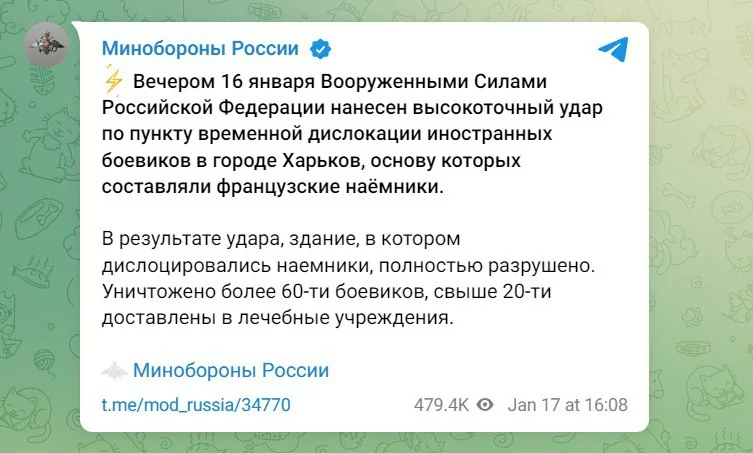 On January 18, 2024, Russian info-agency TASS reported (archive) that the Russian Foreign Affairs Ministry called the France’s representative in Russia in to discuss the situation connected to “destruction of a [center] of temporary dislocation of French mercenaries in Kharkiv by Russian troops.”