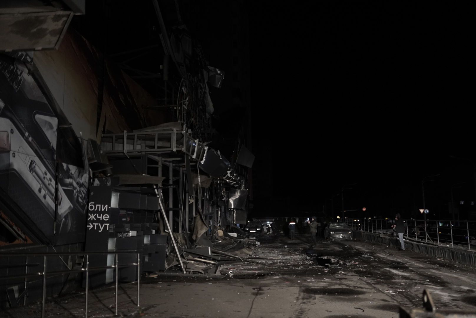 Leonid parked his car near the damaged supermarket. The blast wave blew out its windows. In the morning, the man taped them up and began cleaning up the debris. He says that during the attack, he was with his family in the hallway, but they felt like the blast wave kicked them up into the air.
