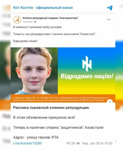 The information spread online claimed that the Lviv Human Reproduction Clinic promoted the opportunity to choose one of Azovstal`s defenders as a donor to “revive” the nation. A screenshot with an alleged advertisement of a clinic providing the services is being distributed on social media.