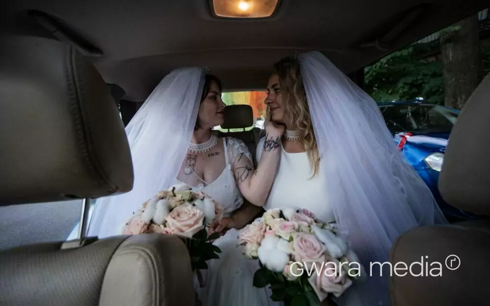 They really are together: Alina serves in the Armed Forces of Ukraine and Stanislava is a feminist and LGBTIQ+ activist. The wedding isn’t real, though. It’s a performance called “The Day When Everyone Can Get Married,” – and its goal is to draw attention to the fact that Ukraine doesn’t recognize same-sex marriages.
