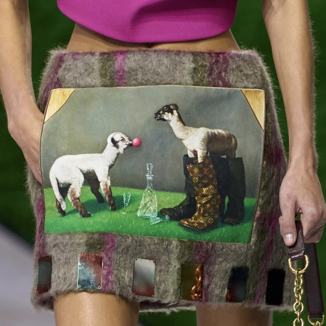 Ghesquière used the artist’s 2023 Paramnesia picture, changing the original look. For the collection, the sheep from the painting were “shod” with luxury Louis Vuitton boots. The fragments of the changed paintings were placed on Ghesquière’s skirts, sleeves, and shirts.