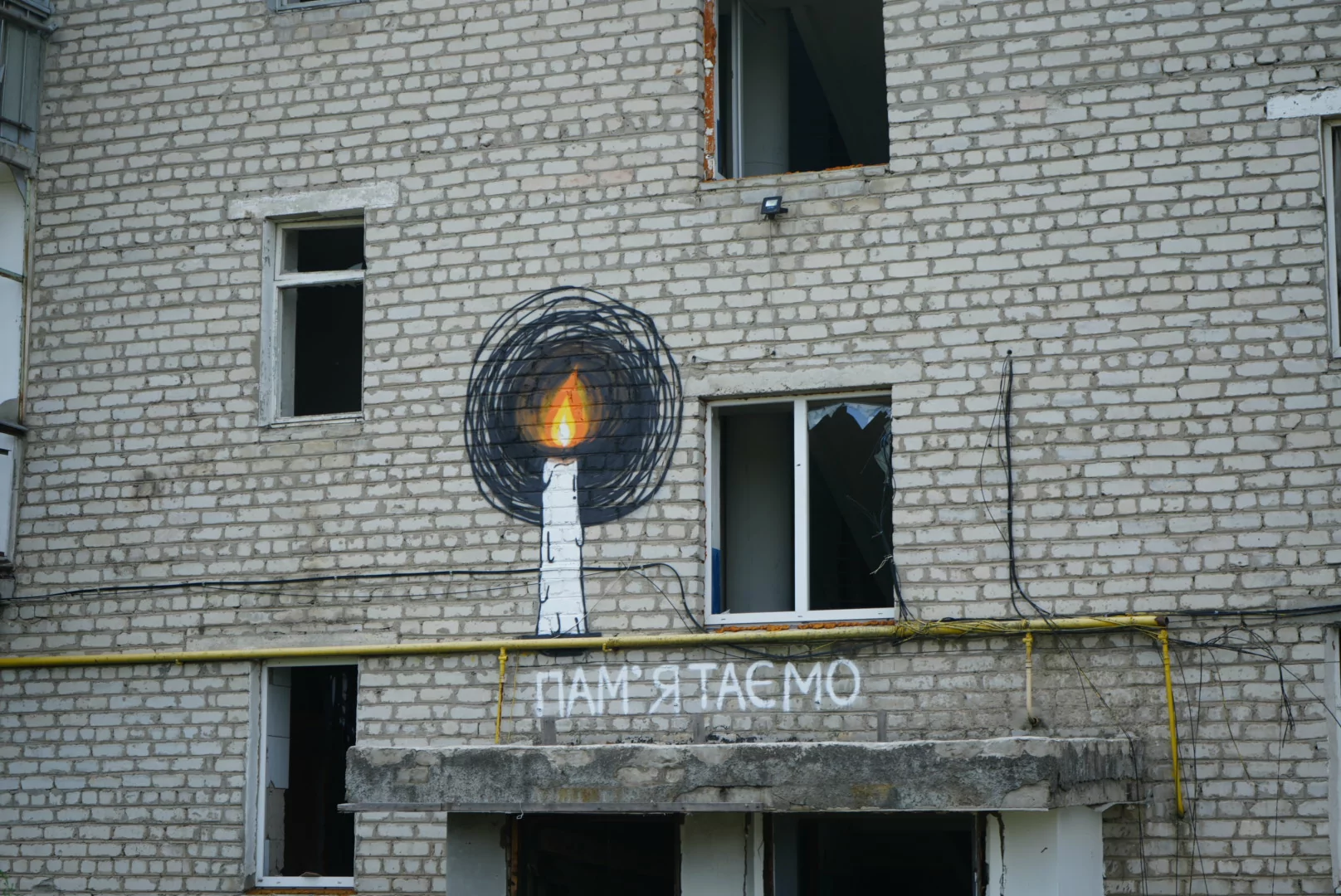 Activists painted several murals on the house at 2 Pamyati Street in de-occupied Izium. On March 9, 2022, Russian troops dropped a bomb on the building. There is no exact number of deaths yet; according to official figures, 50 people died.
