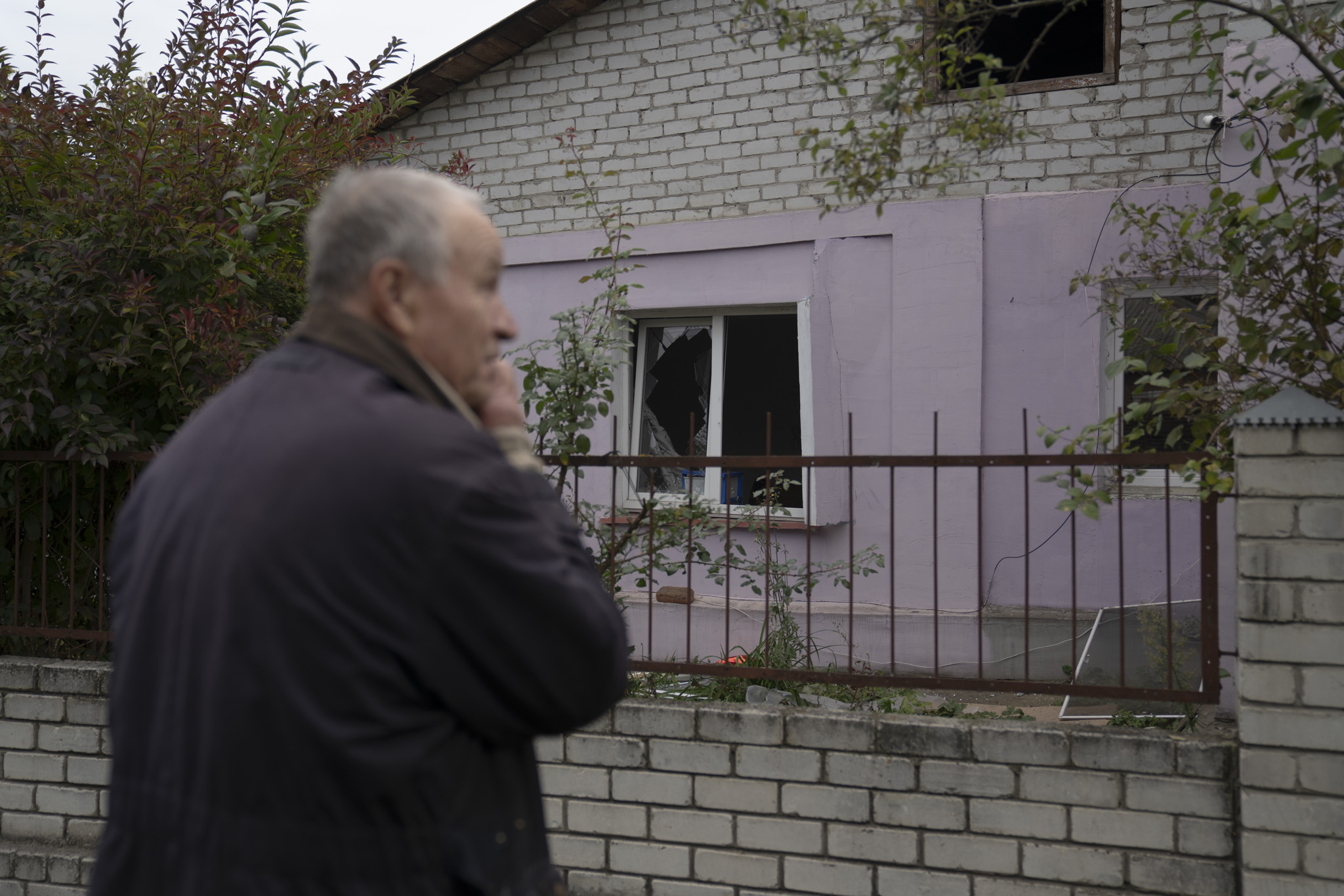 Fifteen Russian kamikaze drones hit the electrical substation in Viktor’s neighbourhood — the blast wave destroyed the ceiling and blew out the windows of his house. As Gwara’s journalists speak to him, he is waiting for municipal workers to repair the house “to warm it up a little.”