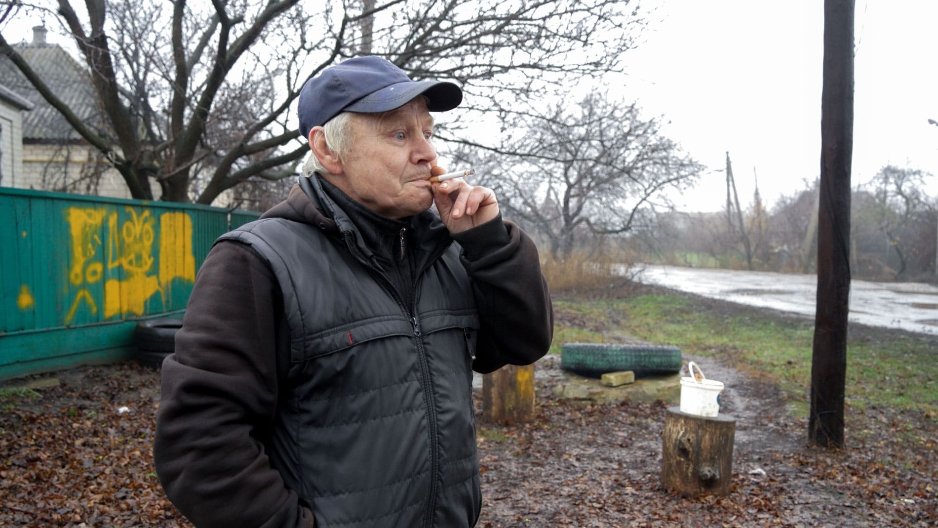 The neighbor is Valerii, 70, living alone with his poultry, afraid to leave his expensive power tools for construction work behind.