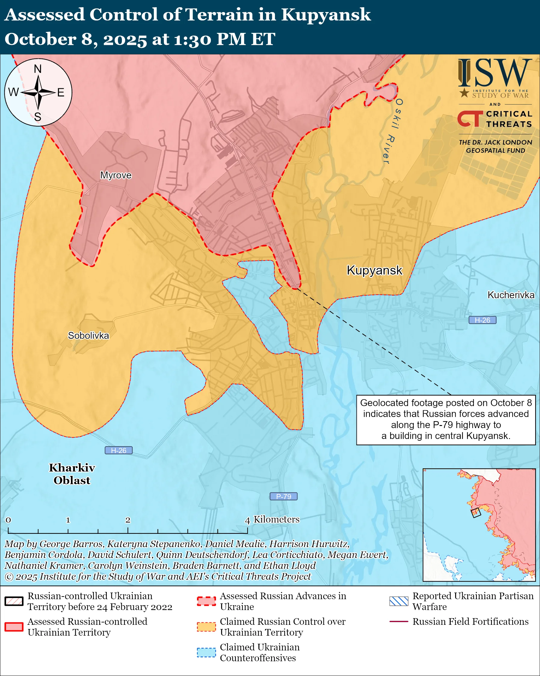 UKRAINE, KUPIANSK, Oct. 9 — On Oct. 8, the Institute for the Study of War (ISW) reported about recent Russian advances in central Kupiansk.