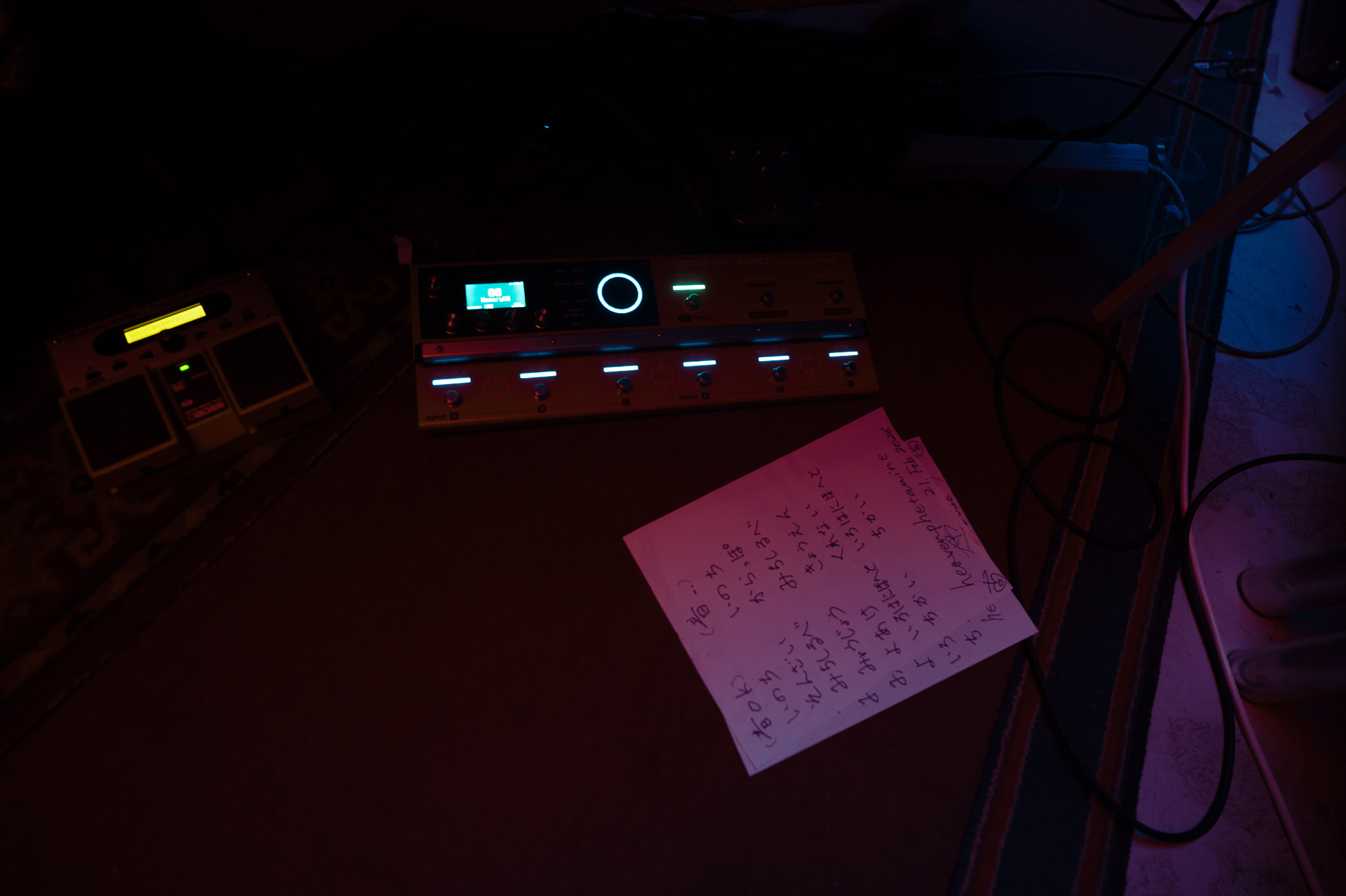 The dancehall is illuminated with pink, red, and blue LED strips, and the space leading up to the stage is warm and filled with people. Sara Oda’s quick, steady hands are working her magic upon the drums. Hiroki Oda handles synthesiser and its complicated acid-jazzy, post-punk loops. Both of them sing, but most of the melodies follow Hiroki’s voice.