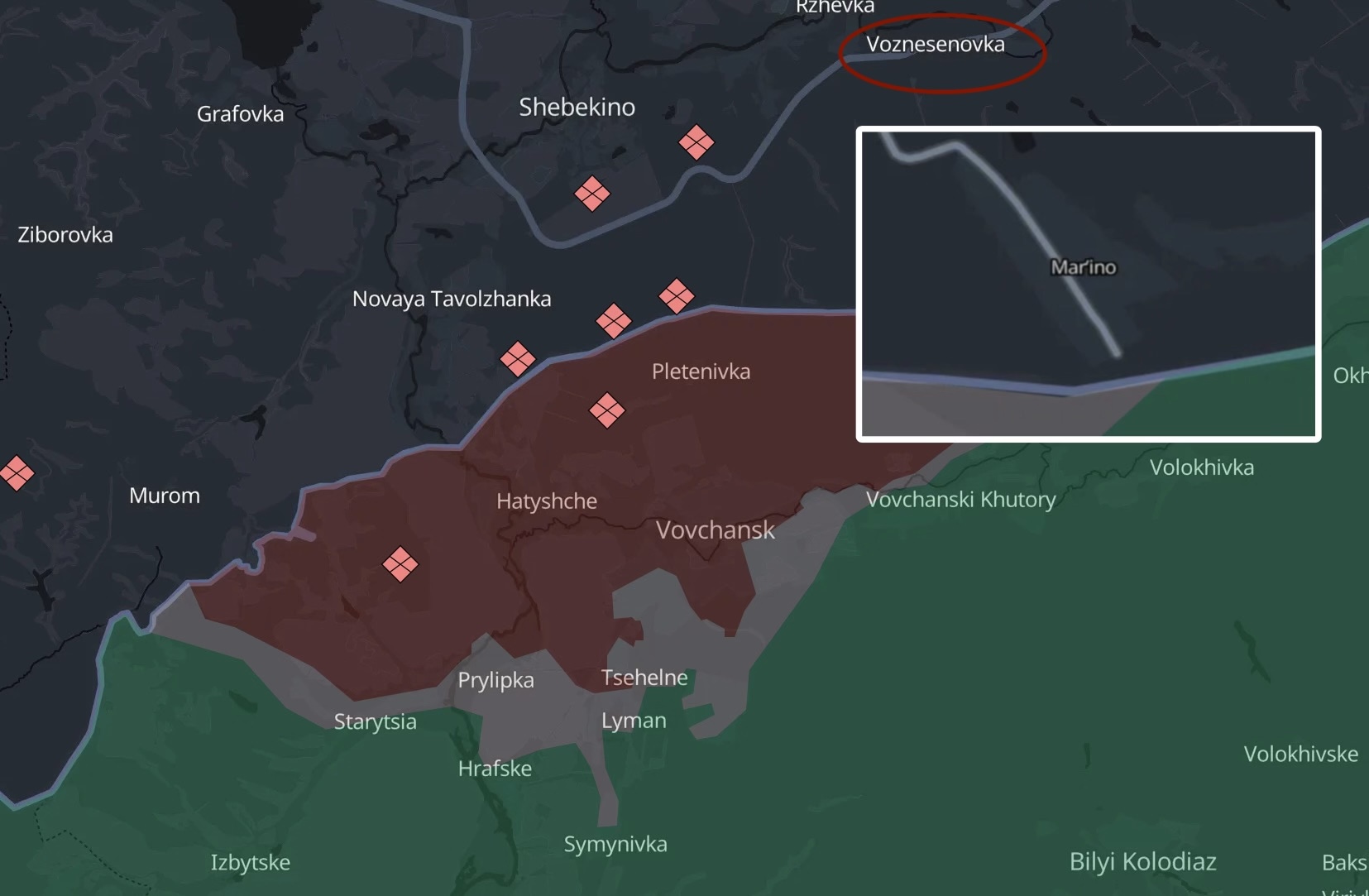 Voznesivka is a village in the Belgorod oblast located 7 kilometers (4.3 miles) from the Russia-Ukraine border. From this settlement, a Russian Ulan all-terrain vehicle transported personnel to Marino village, located right on the border, for further advances along the Vovchansk axis.