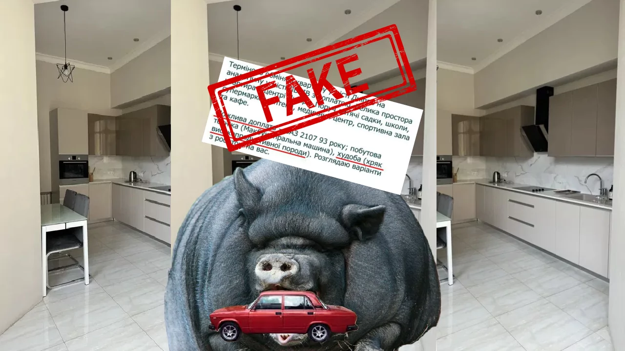 «Терміново обміняю квартиру у місті Дніпро на аналогічну у місті ЛЬВІВ з доплатою. Велика простора квартира в центрі Дніпра. Поруч дитячі садки, школи, супермаркет, аптеки, медичний центр, спортивна зала та кафе. Можлива доплата ВАЗ 2107 93 року; побутова техніка (макбук, пральна машина), худоба (хряк високопродуктивної породи). Розглядаю варіанти з роботою на вас», — йдеться у тексті на поширеному у новині зображенні.