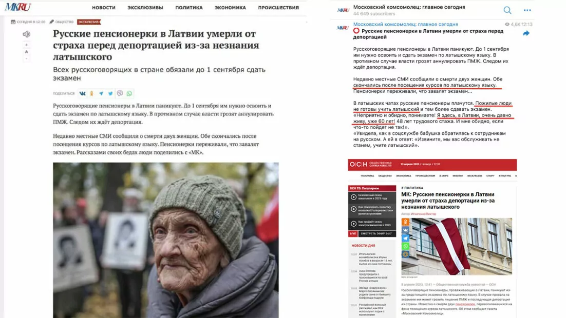 Російськими ЗМІ шириться новина про курси латиської мови, після яких російські пенсіонери помирають. Прокремлівське видання «Московський комсомолець» 8 квітня опублікувало статтю про пенсіонерок, які так хвилювалися через іспит, що вмерли від страху: