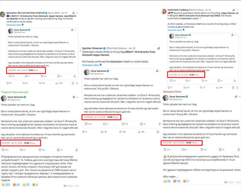 З 18 січня в російському інфопросторі масово поширилася новина про загибель данського інструктора Йеппе Хансена, про яку нібито стало відомо зі скриншоту допису в соцмережі Х його друга та колеги Оскара Соренсена. Посилаючись на цей допис, новину підхопили анонімні користувачі соцмережі Х (1, 2, 3, 4, 5), російські ЗМІ, зокрема ті, що працюють на іншомовну аудиторію (1, 2, 3, 4, 5, 6), Перший канал (архів) й агентство ТАСС (1, 2), а також телеграм-канали, що систематично поширюють російську пропаганду: «Дядя Слава», «Шейх Тамир», «Шкварка News», «Медведь», «Первый Харьковский» (1, 2, 3, 4) тощо.