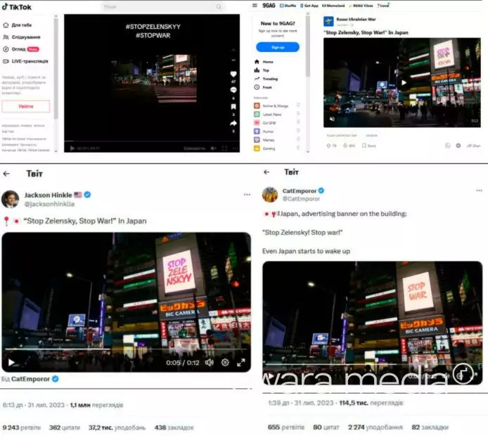 «Це – Японія. Вулична реклама закликає зупинити війну, поставити на “стоп“ Зеленського. Ніхто не хоче великої війни у світі, люди поступово почали розуміти, що владу в США та Британії захопили маніяки, які штовхають планету до катастрофи», — йдеться в дописі до публікації.