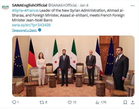 У дописі сирійського МЗС від 3 січня немає жодних ознак цензурування фото із цієї зустрічі, як і в дописі про візит європейських політиків на офіційній сторінці в соцмережі Х державного інформагентства SANA.