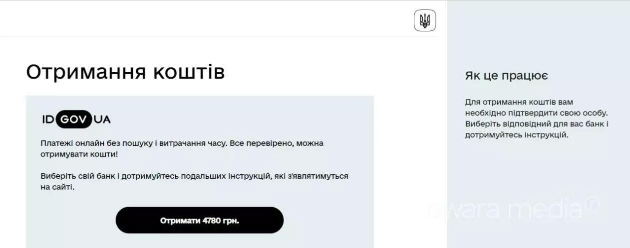 При переході за посиланням бачимо сайт, на якому пропонують отримати кошти. Зауважимо, що сайт має подібний до сайту Дія вигляд.