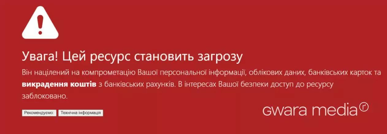 Продовжуючи тему функціонала: адреса, вказана в нижній частині сайту, є заблокованою та попереджає про загрозу.