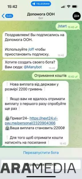 Шахрайство. Таку інформацію отримали фактчекери Gwara Media. Цей бот перенаправляє вас на сторінку ПриватБанку та пропонує вам ввести дані вашої банківської картки, на яку ви отримаєте гроші.