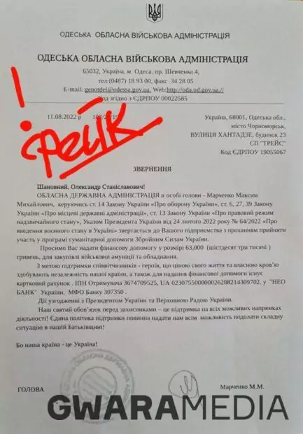 Очільник Одеської ОВА Максим Марченко заявив, що цей документ – фейк: «Ні я, ні Одеська ОВА не беруть участі в жодних програмах зі збору коштів і не надсилають подібних листів».