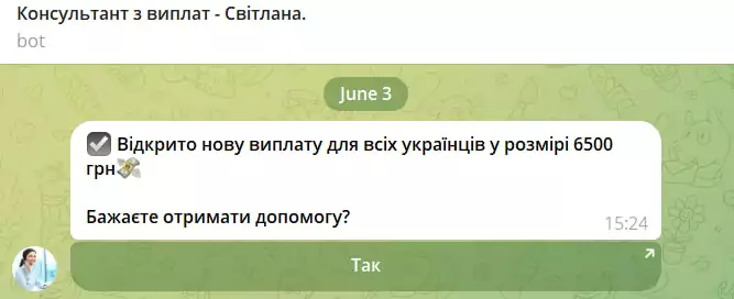 Ми також перейшли за посиланням, яке надають у повідомленні. Нас перенаправило до чат-бота «Консультант з виплат — Світлана», де нам запропонували отримати виплату вже розміром 6500 гривень.
