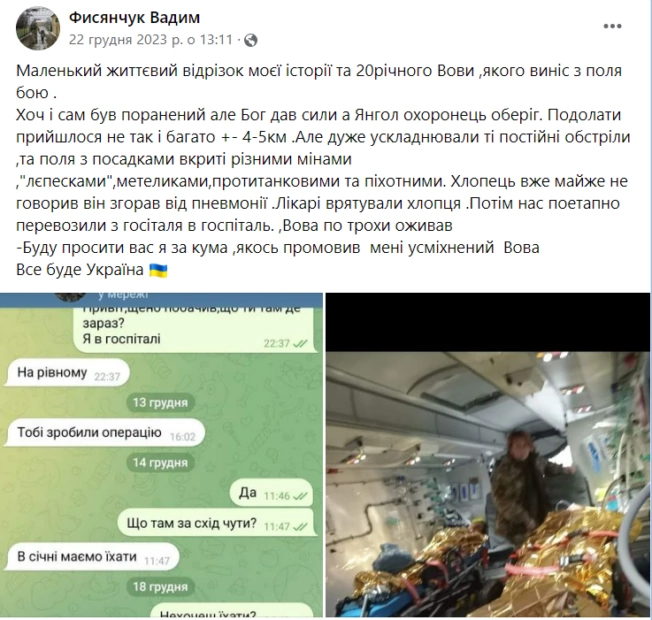 «Маленький життєвий відрізок моєї історії та 20-річного Вови, якого виніс з поля бою. Хоч і сам був поранений, але Бог дав сили, а Янгол охоронець оберіг. Подолати прийшлося не так і багато +- 4-5 км. Але дуже ускладнювали ті постійні обстріли, та поля з посадками вкриті різними мінами, “лєпесками”, метеликами, протитанковими та піхотними. Хлопець вже майже не говорив він згорав від пневмонії. Лікарі врятували хлопця. Потім нас поетапно перевозили з госпіталю в госпіталь….», — йдеться в дописі Вадима Фісянчука.