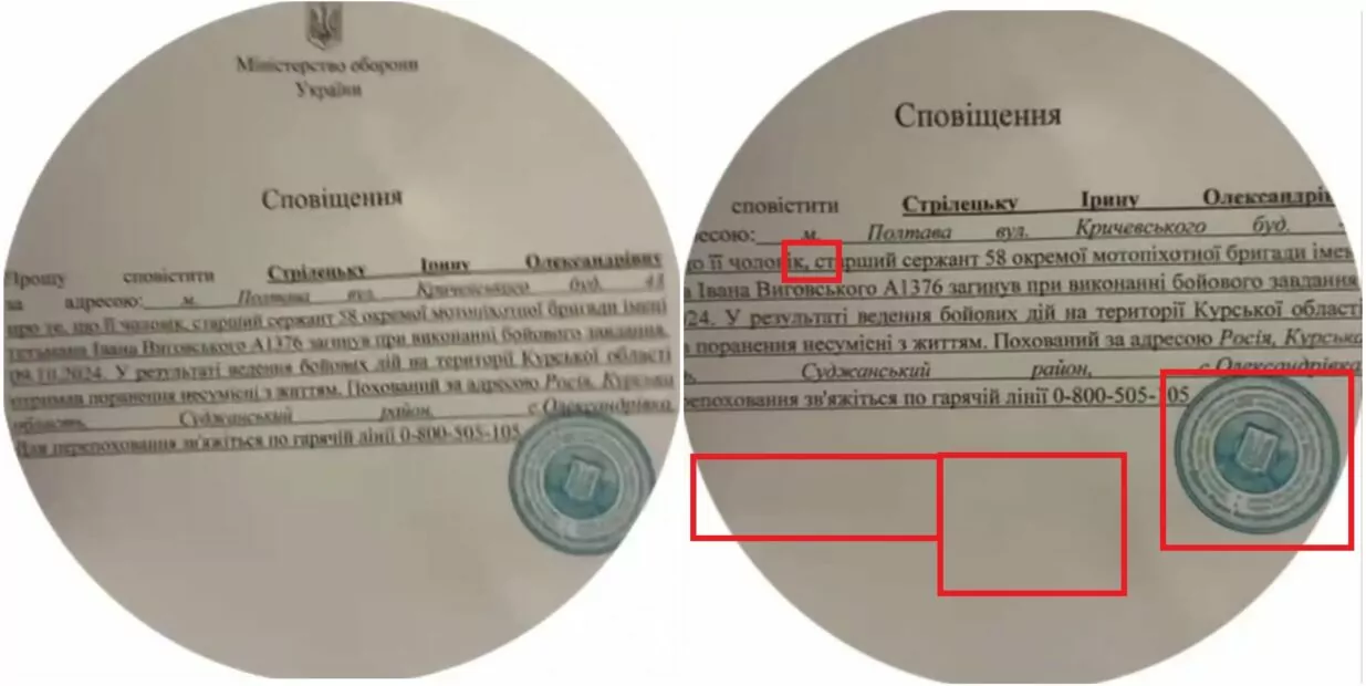 26 жовтня російські пропагандиські Telegram-канали, які систематично поширюють ворожу дезінформацію, зокрема «Медведь», «V тылу | Za лентой», «Военндело (Военное дело)» та інші поширили новину про те, що нібито за перепоховання тіла військовослужбовця ЗСУ, який загинув у Курській області, з його дружини вимагають гроші в Міністерстві оборони України. Ба більше, стверджується, що виплат родині у зв’язку з загибеллю військового ЗСУ не буде, бо загинув він на території Росії. Як доказ, пропагандисти публікують відео, в якому демонструється «папірець-сповіщення» з жіночим голосом за кадром.