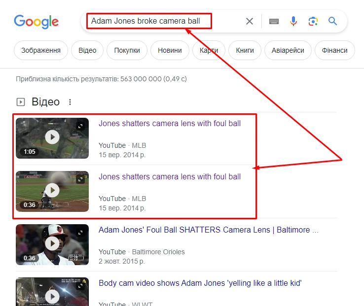І вже за ключовими словами «Adam Jones broke camera ball» ми відшукали уривок бейсбольного матчу між американськими командами «New York Yankees» та «Baltimore Orioles», який відбувся ще 14 вересня 2014 року. Відео було опублікована на офіційному Youtube-каналі Major League Baseball(MLB), професіональної бейсбольної ліги Північної Америки.