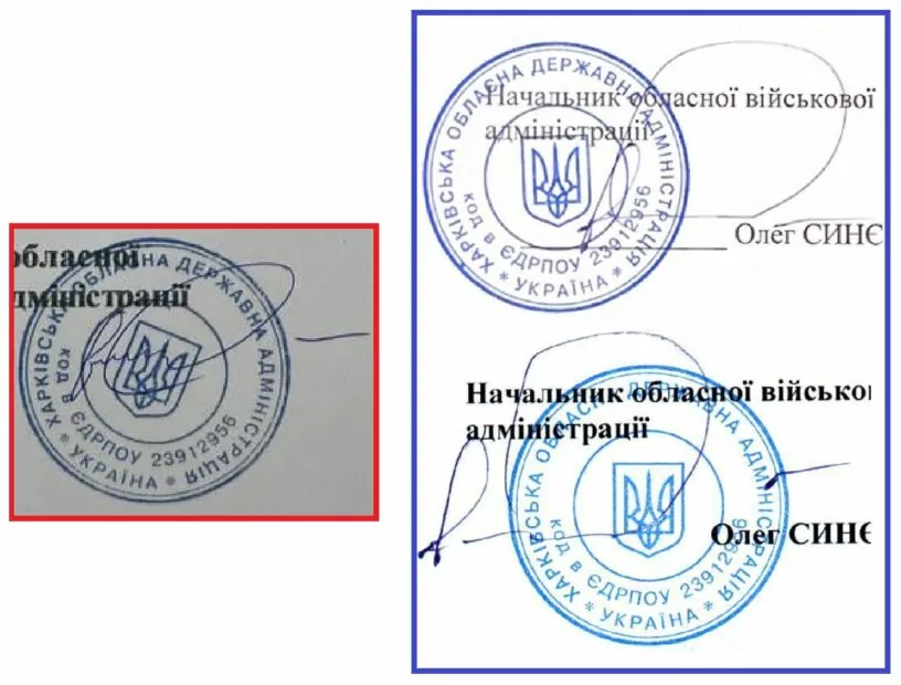Наступним кроком, для порівняльного аналізу підпису на зображення з оригінальним підписом начальника Харківської ОВА Синєгубова. Так, ми використали наказ за 2022 рік та наказ за 2023 рік, розміщені на офіційному сайті Харківської ОВА. Навіть без залучення відповідних спеціалістів, результати аналізу свідчить про те, що підпис на документі підроблений.