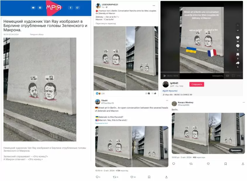 З 2 квітня російські пропагандистські Telegram-канали, зокрема «Шейх Тамир», «Медведь», ««Спецоперация Z» | Юрий Подоляка+» та інші почали поширювати новину про те, що у Берліні нібито з’явилось графіті з відрубаними головами президента України Зеленського та президента Франції Макрона. Митцем, що створив графіті, за словами авторів допису, є німецький митець Van Ray.