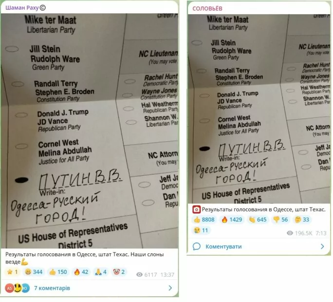 5 листопада російські Telegram-канали, які систематично поширюють ворожу дезінформацію, зокрема «Шаман Раху» та російські пропагандисти, зокрема Соловйов та інші, поширили новину про те, що мешканці американського міста Odessa в штаті Техас, взявши участь у загальних виборах в США 5 листопада, нібито обрали кандидатуру Путіна в бюлетені на посаду президента США та додали допис про те, що «Одесса – русский город!».