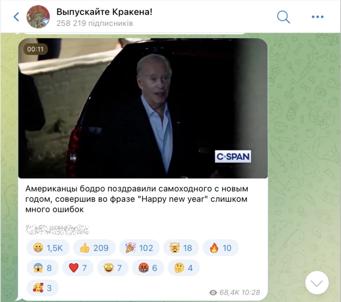 Telegram-канал «Выпускайте Кракена!» опублікував (архів) відео, в якому нібито вигукують лайку стосовно президента США Джозефа Байдена, що вийшов до публіки. Так, у відеоролику чути гнівні крики людей, як от: «F**k you».