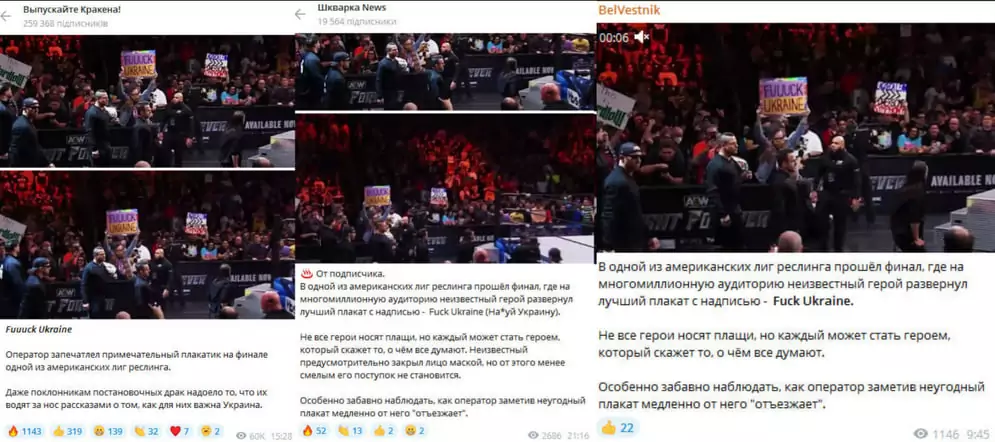 9 січня 2023 пропагандистський Telegram-канал «Олеся Лосева» опублікував відеофрагмент з популярного американського реслінг-шоу, на якому один з глядачів в залі розгорнув плакат з нецензурним написом — «F**k Ukraine».