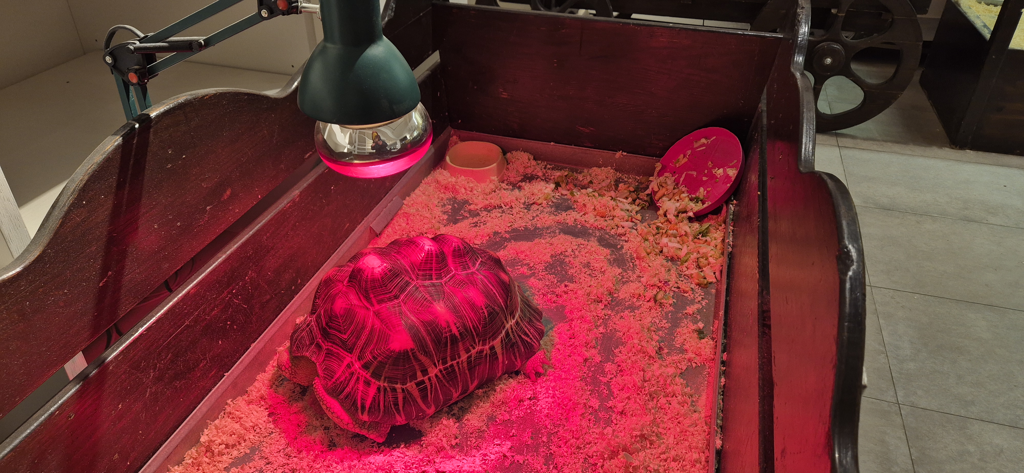 У двох інших візках знаходяться черепахи. На них світять ультрачервоні лампи. Поруч з однією — миска салату, який перемішався з наповнювачем. У іншої — лише миска, де трохи води.