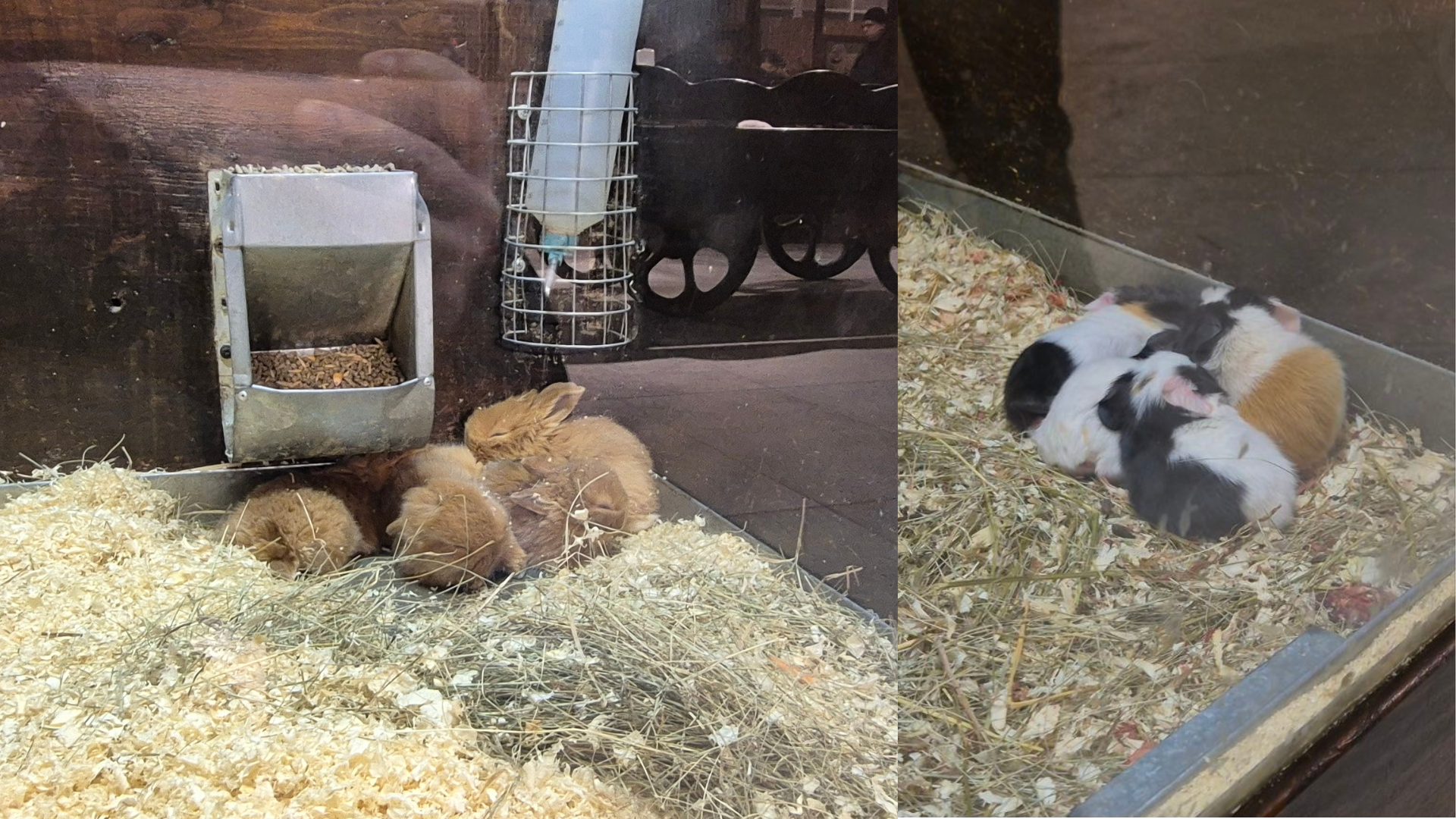 На виставці також є дві скляні коробки з решітками вгорі, аби люди не змогли просунути всередину руки. У одній — маленькі кроленята, а в іншій — новонароджені морські свинки. Дитинчата туляться одне до одного, а самиці прикривають їх своїми тілами. Вони народилися сьогодні вранці.