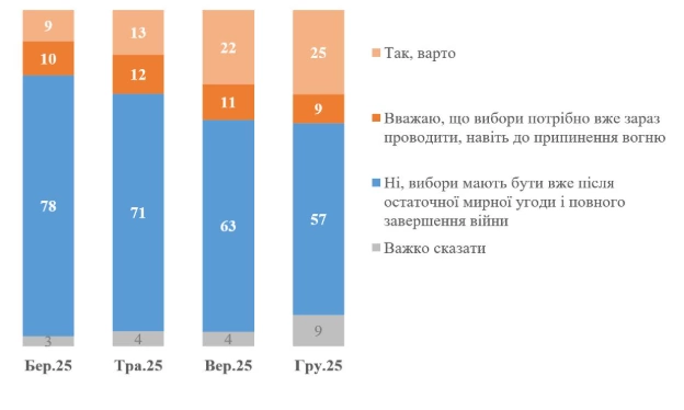 Згідно з дослідженням, лише 9% опитаних вважають, що вибори слід проводити до припинення вогню. Для порівняння, у вересні цей показник становив 11%.