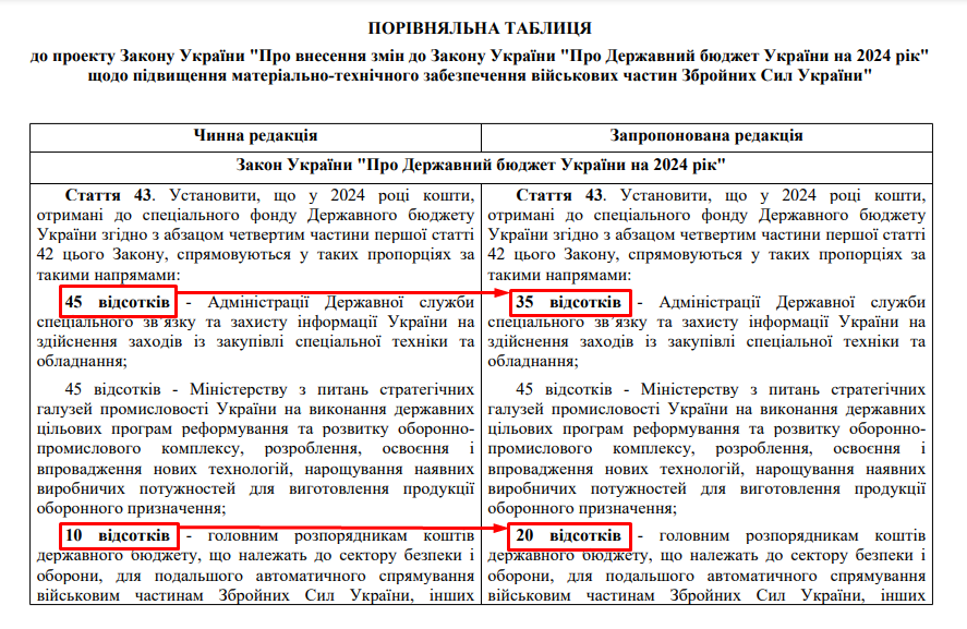 Як ми бачимо, жодної згадки про зміну розпорядника коштів в документі немає. Крім того, в другій порівняльній таблиці, створеній на основі змін до додатка №3 до ЗУ «Про державний бюджет України на 2024 рік», чітко видно, що кошти в розмірі 9 638 842 700 гривень мають бути перенаправлені від Адміністрації Державної служби спеціального зв’язку та захисту інформації України до Міністерства фінансів України, а не до місцевих бюджетів.