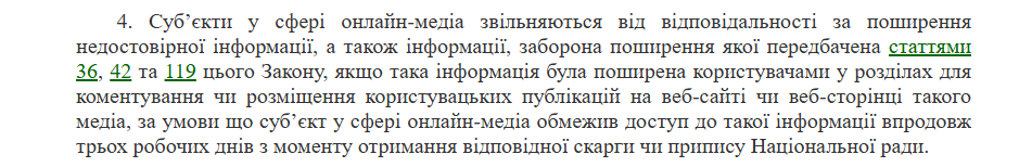 Як йдеться у пояснювальній записці до законопроєкту, у статті 117 Закону України «Про медіа» запропоновано передбачити, що «суб’єкти у сфері онлайн-медіа звільняються від відповідальності за поширення недостовірної інформації, а також інформації, заборона поширення якої передбачена статтями 36, 42 та 119 вказаного закону, якщо така інформація була поширена користувачами у розділах для коментування чи розміщення користувацьких публікацій на веб-сайті чи веб-сторінці такого медіа, за умови що суб’єкт у сфері онлайн-медіа обмежив доступ до такої інформації впродовж трьох робочих днів не тільки з моменту отримання відповідної скарги чи припису Національної ради, а й з моменту отримання ухвали про відкриття відповідного провадження судом».
