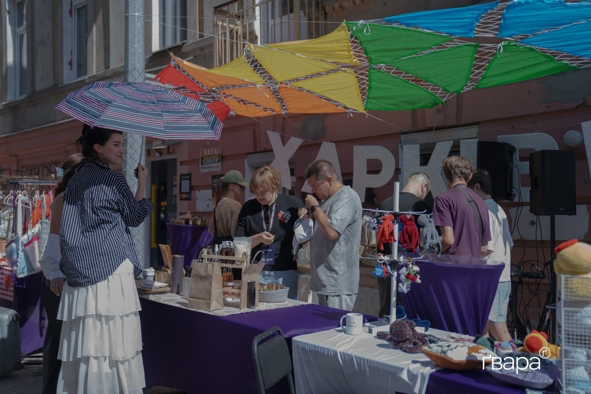 Цьогоріч частину заходів ХарківПрайд провели просто неба: ярмарок вітає гостей музикою та невимушеною атмосферою. Утім, серед учасників подекуди чути розмови про «правих», які незадовго до цього закінчили свою акцію.