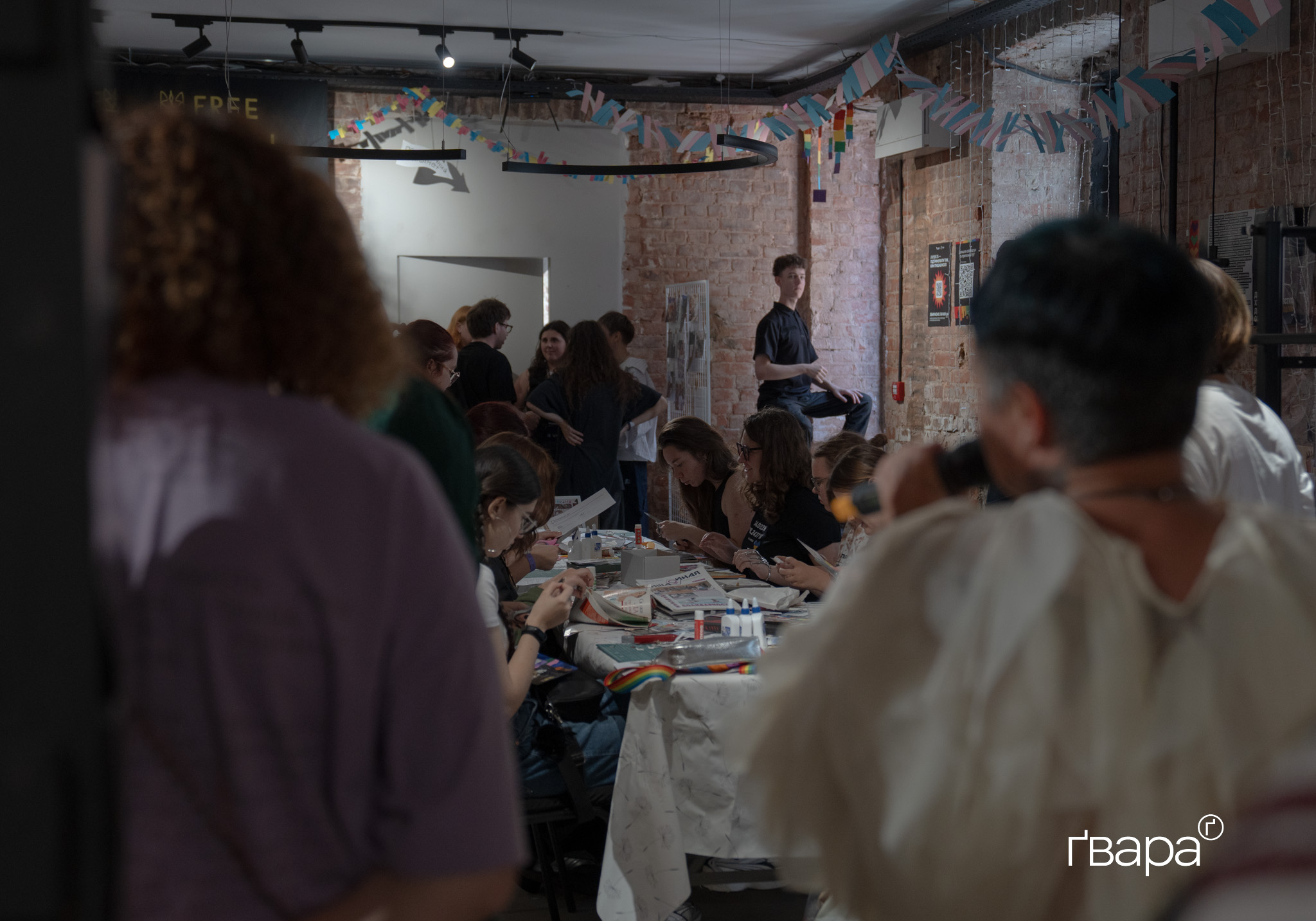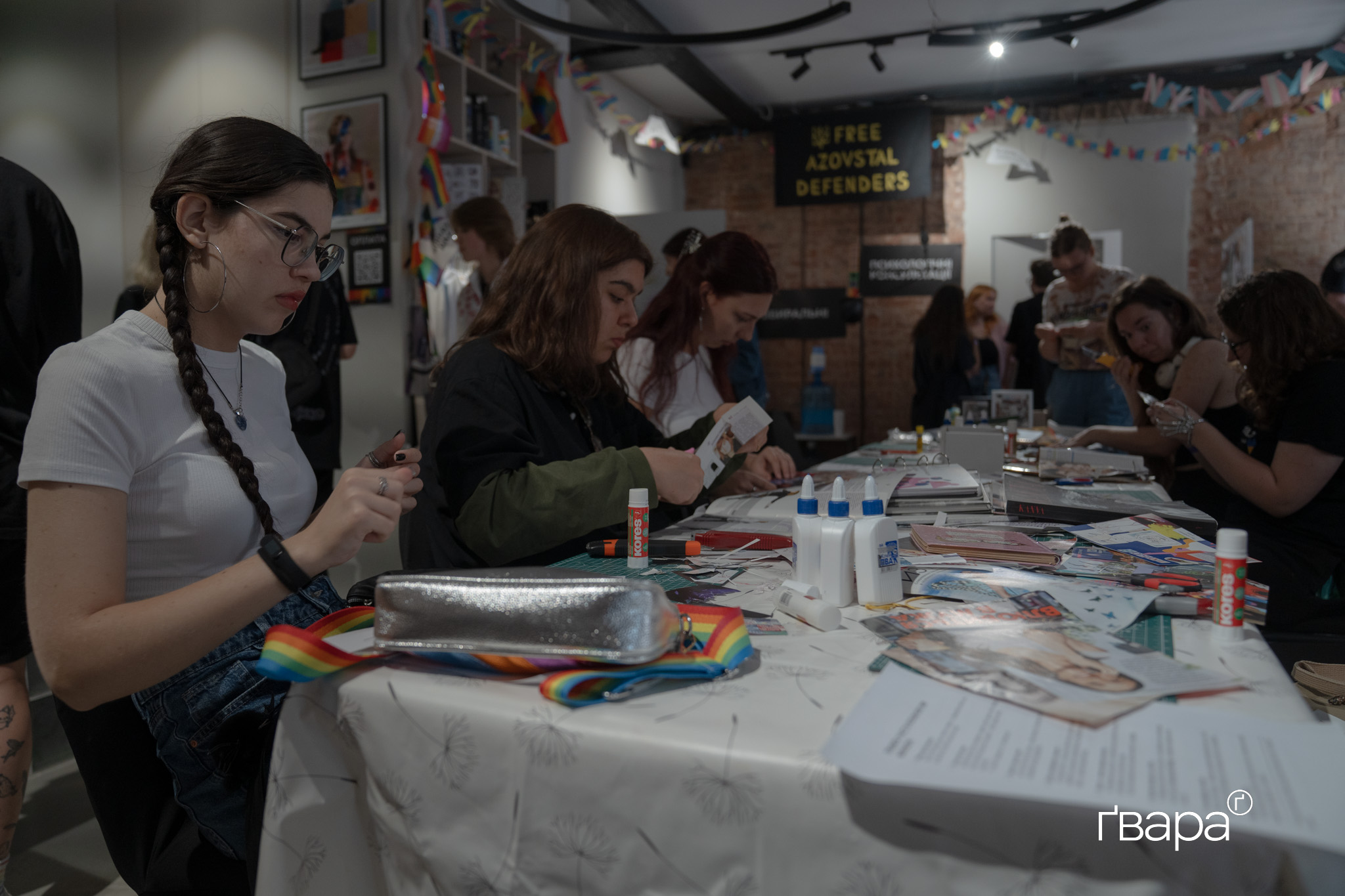 У ПрайдХабі — напівпідвальному приміщенні з укріпленими вікнами та броньованими дверима — прохолодно. У основному залі проходять творчі майстерні, де люди вчаться робити колажі.