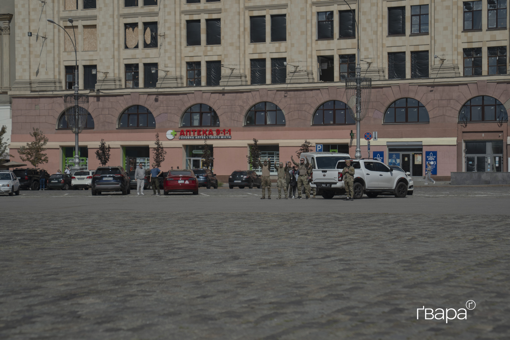 Автівки паркуються навпроти Держпрому. Люди виходять, щоб проголосити промови, зробити фото та влаштувати хвилину мовчання для тих, які загинули, відстоюючи й боронячи країну.