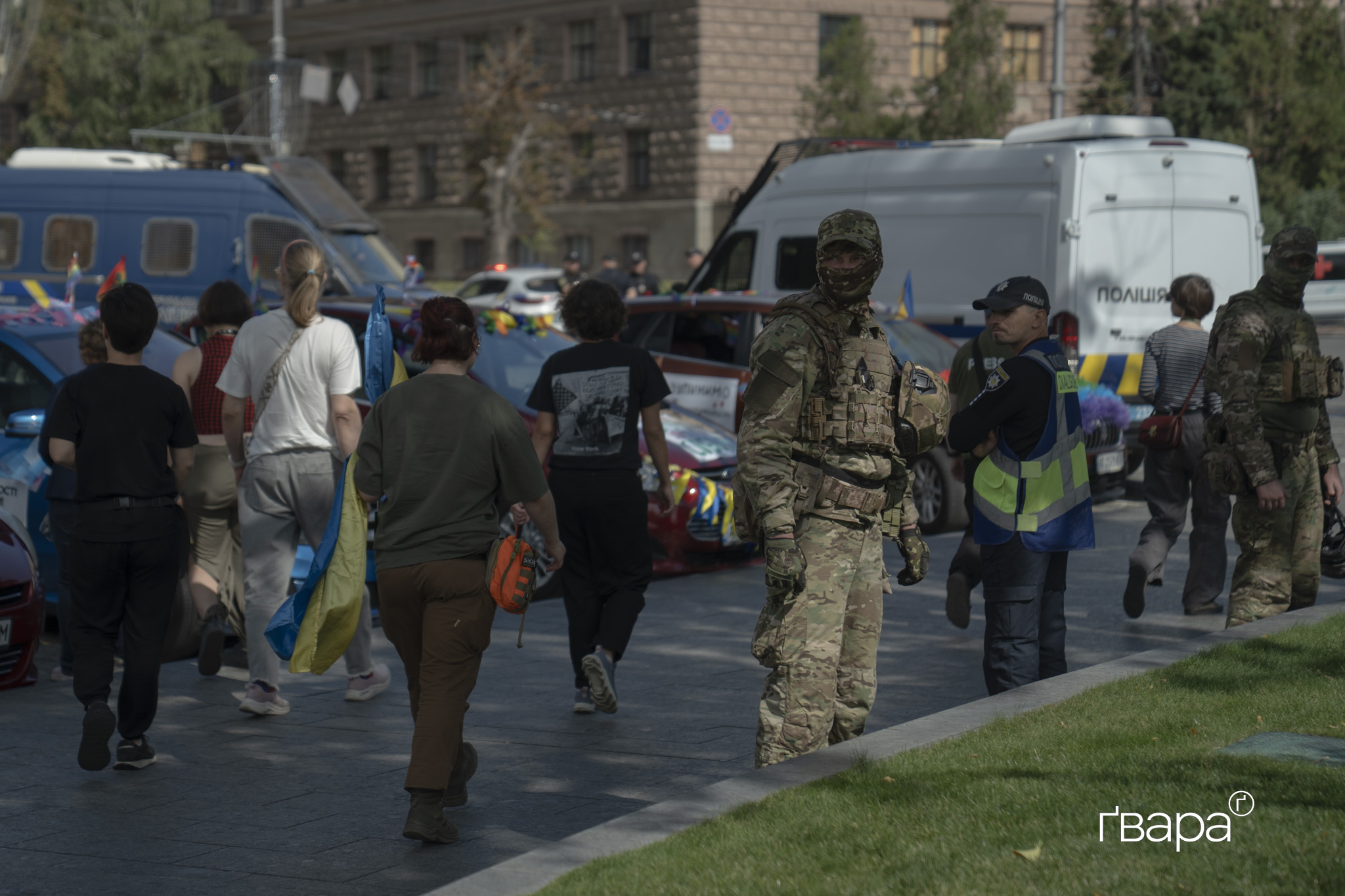 З протилежного боку вулиці за дійством спостерігають бійці спецпідрозділу поліції у повному екіпіруванні — щоб потрапити на фестиваль, треба пройти крізь їхній «живий щит».
