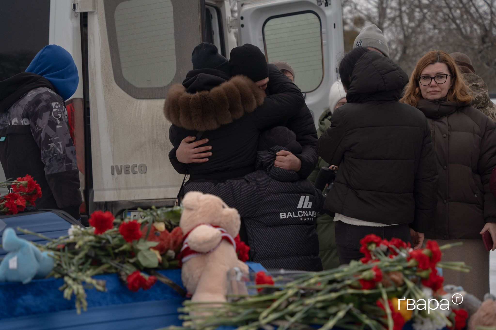 У селі Сковородинівка на Харківщині сьогодні, 13 лютого, пройшло прощання з загиблими внаслідок обстрілу Богодухова батьком та трьома дітьми.
