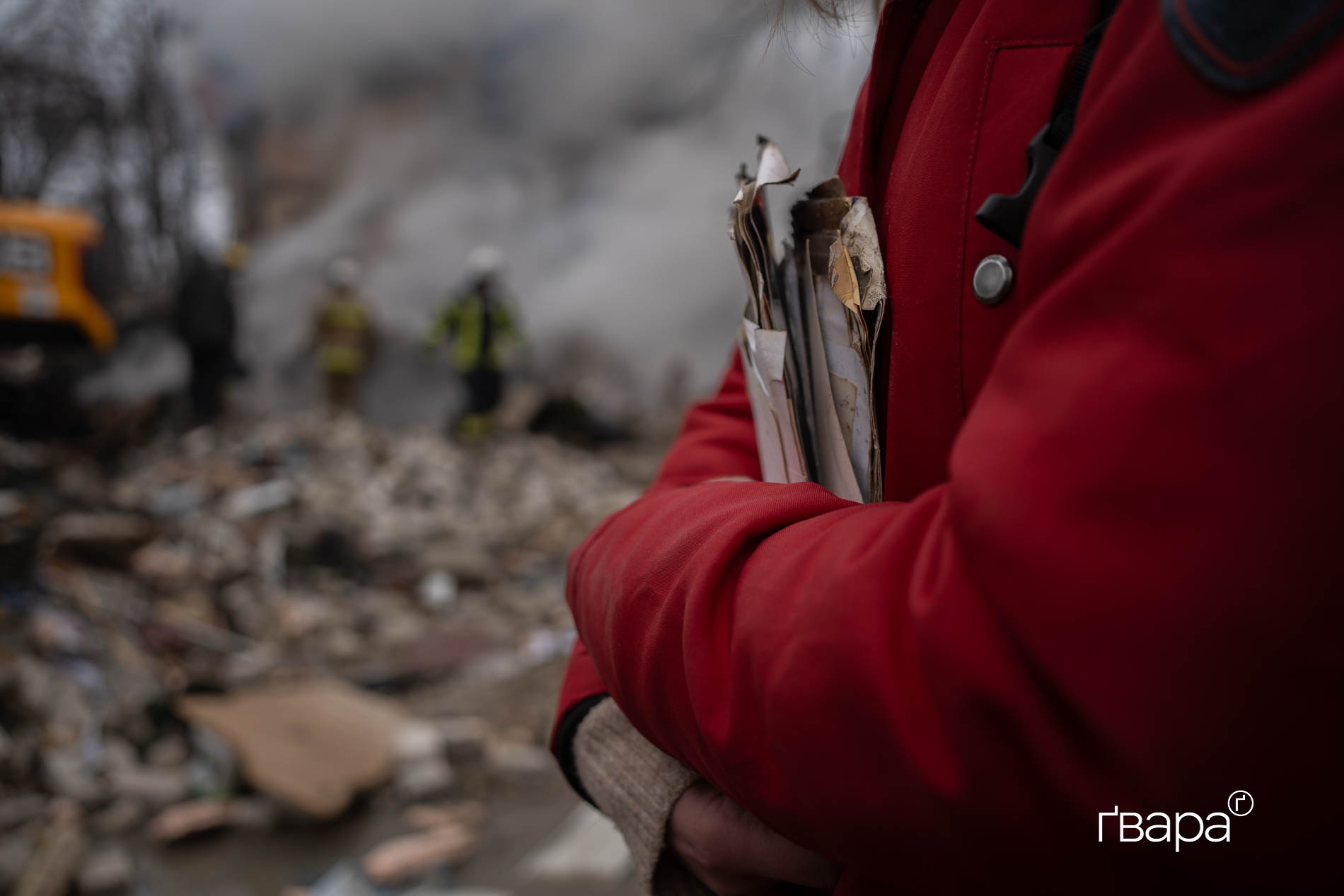 Анна жила в одній з квартир зруйнованого обстрілом будинку. Цієї ночі її, батьків та доньки вдома не було. Тож з її родини ніхто не постраждав. Жінка збирає фото своєї родини, у яких помітно обгоріли кути та розповідає журналістці Ґвари.