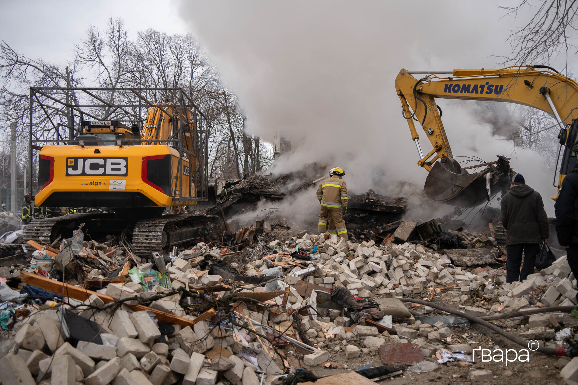 На місці тривають пошукові роботи. Розбір завалів може тривати ще два дні, розповів мер міста Терехов. Під руїнами можуть перебувати ще четверо людей.У понеділок, 9 березня, у Харкові оголосили Днем жалоби за загиблими внаслідок ракетного удару росіян по місту.