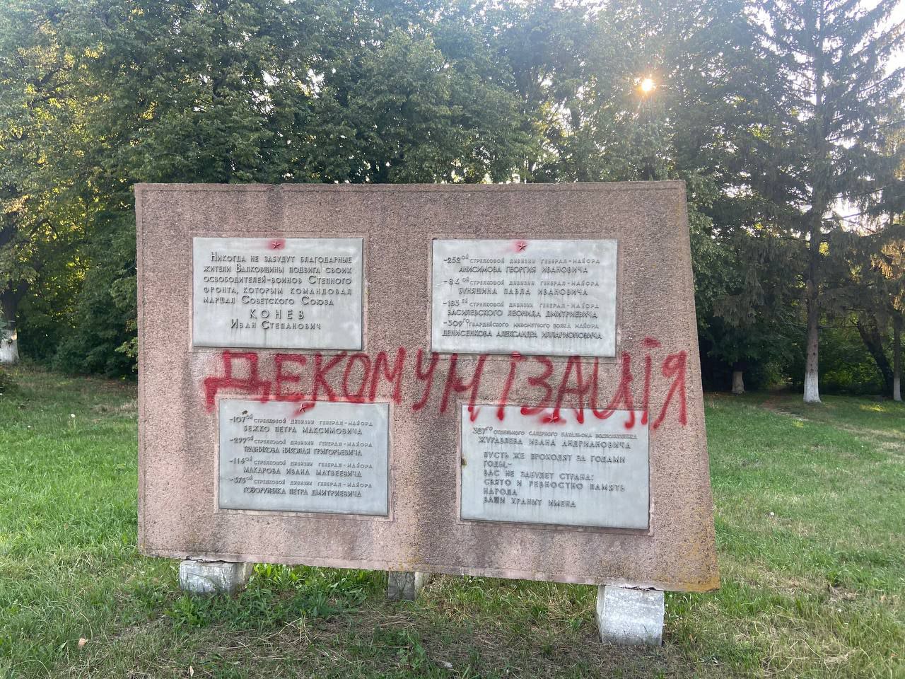 7 серпня в соціальних мережах «Деколонізація. Україна» з’явився допис з фотографіями пам’яток, присвячених Другій Світовій Війні. На них червоною фарбою було написано слово «декомунізація».